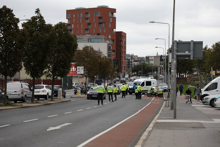 Policiais verificam veículos em uma rua de Dublin, Irlanda, no dia 19 de setembro de 2020. (Xinhua)