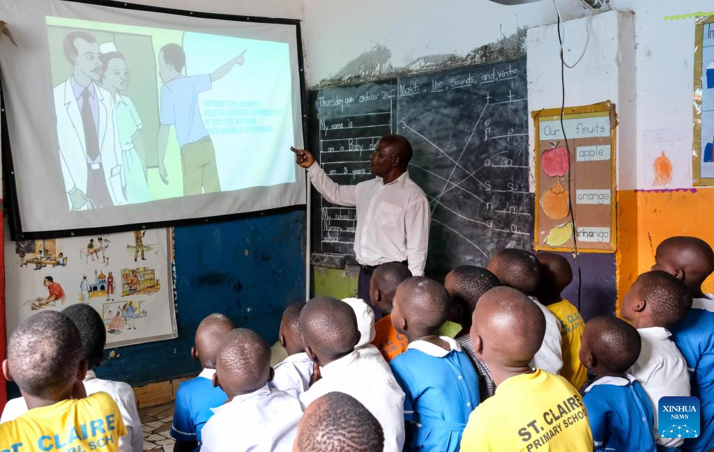 Alunos assistem a aula sobre Ebola usando um projetor StarTimes na St. Claire Primary School em Campala, Uganda, no dia 13 de outubro de 2022. O projeto "Acesso à TV por satélite para 10.000 aldeias africanas" em Uganda é implementado pela televisão por satélite chinesa, StarTimes. Este projeto é um dos resultados das resoluções do Fórum de Cooperação China-África da Cúpula de Joanesburgo realizado em 2015 na África do Sul. (Foto por Hajarah Nalwadda/Xinhua)