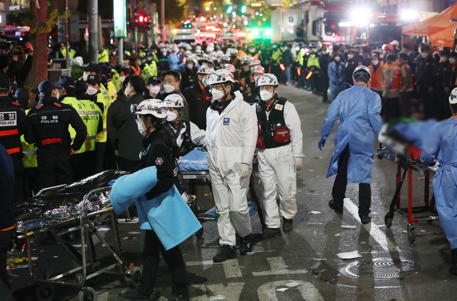 Socorristas trabalham no local do acidente provocado por uma debandada em Itaewon, distrito de Seul, Coreia do Sul, em 30 de outubro de 2022. (NEWSIS via Xinhua)