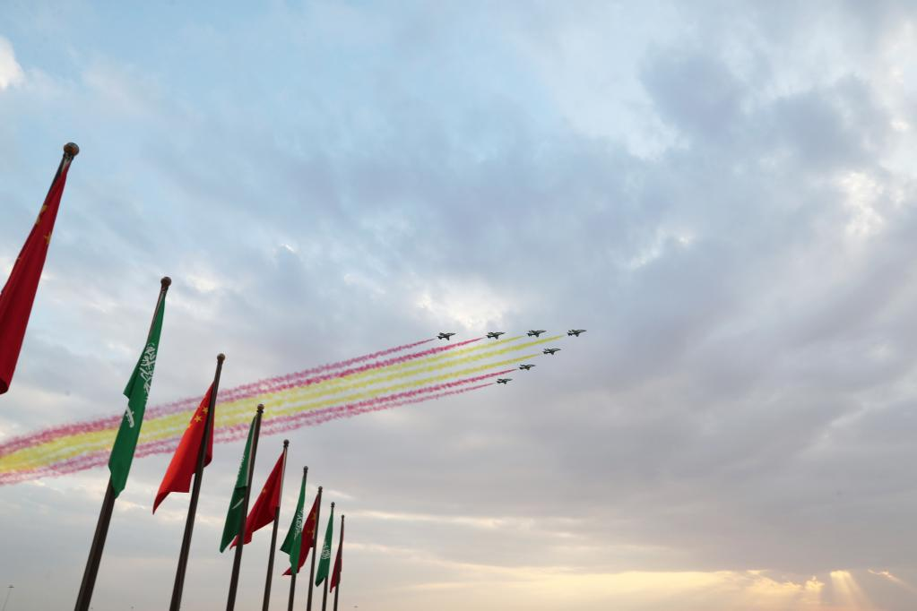 Guardas de honra ladeavam o tapete roxo. As bandeiras nacionais da China e da Arábia Saudita tremulavam ao vento. O presidente chinês foi calorosamente recebido pelo governador da Província de Riad, o príncipe Faisal bin Bandar Al Saud, pelo ministro das Relações Exteriores, o príncipe Faisal bin Farhan Al Saud, pelo ministro Yasir Al-Rumayyan que trabalha em assuntos da China, e por outros membros importantes da família real e altos funcionários do governo.