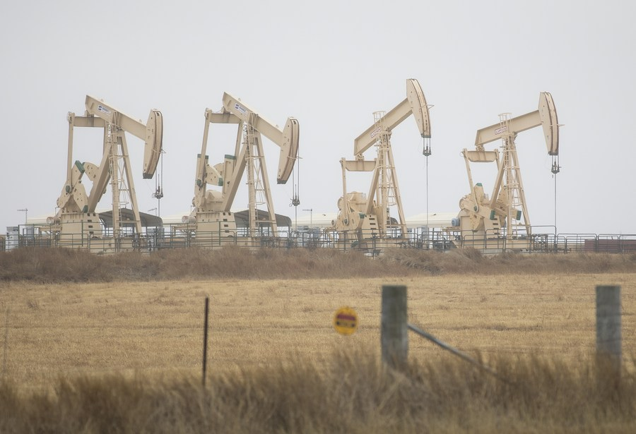 Torres de perfuração operam em Three Rivers, Texas, Estados Unidos, em 24 de fevereiro de 2022. (Foto por Nick Wagner/Xinhua)