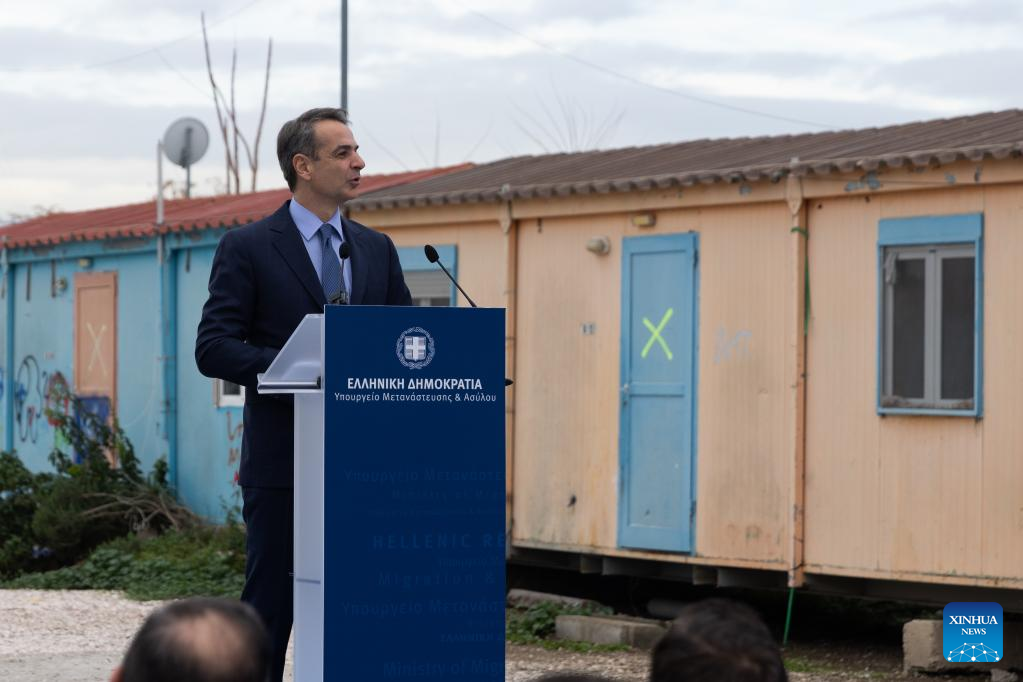 O primeiro-ministro grego, Kyriakos Mitsotakis, fala em um evento no campo de Eleonas em Atenas, Grécia, em 12 de dezembro de 2022. (Foto por Lefteris Partsalis/Xinhua)