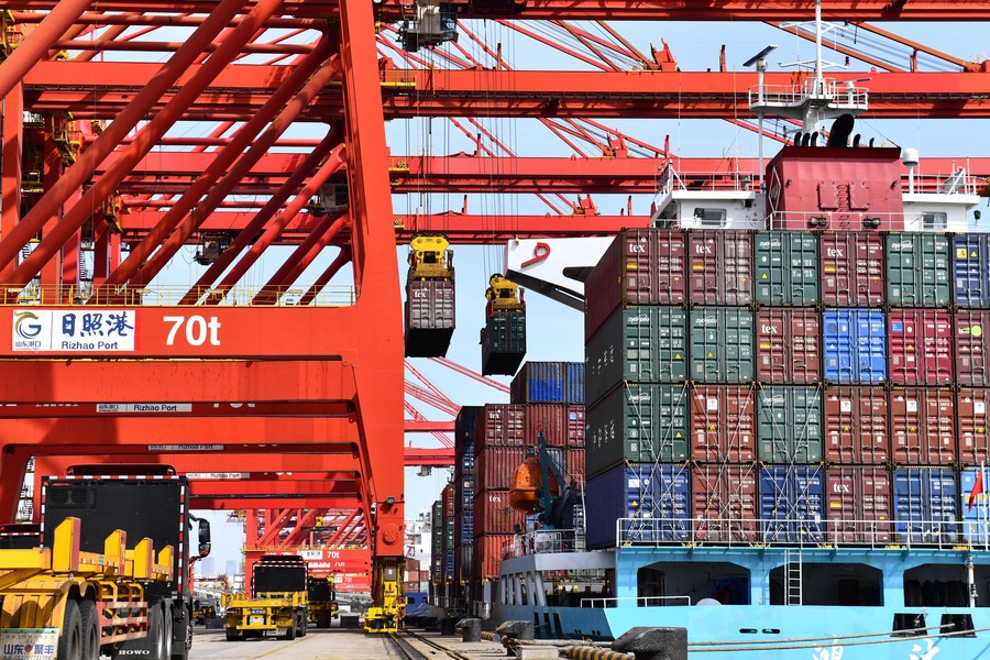 Caminhões esperam para carregar contêineres em um terminal em Rizhao, na Província de Shandong, no leste da China, em 28 de março de 2022. (Xinhua/Guo Xulei)