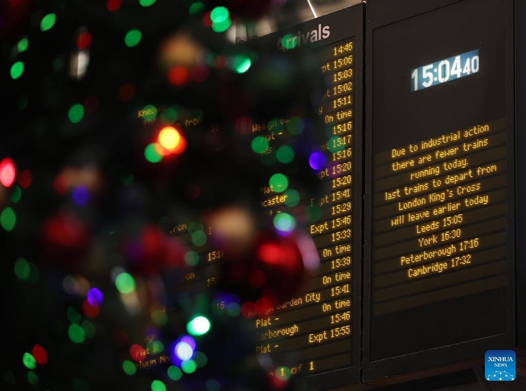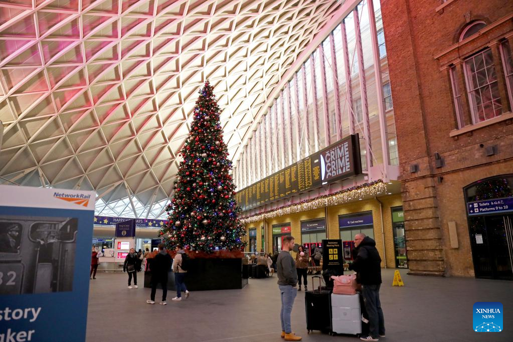 Pessoas são vistas na Estação Ferroviária King's Cross em Londres, Grã-Bretanha, em 17 de dezembro de 2022. O Reino Unido enfrenta semanas de greves massivas durante a temporada de Natal por trabalhadores dos correios e transportes, enfermeiras e guardas de fronteira. Uma onda de ações industriais começou na terça-feira, com mais de 40.000 membros do Sindicato Nacional dos Trabalhadores Ferroviários, Marítimos e de Transportes (RMT, em inglês) parando por 48 horas. Mais três semanas de interrupção estão programadas para acontecer. (Xinhua/Li Ying)