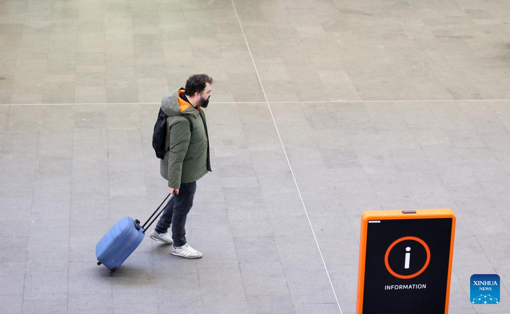Um passageiro caminha na Estação Ferroviária King's Cross em Londres, Grã-Bretanha, em 17 de dezembro de 2022. O Reino Unido enfrenta semanas de greves massivas durante a temporada de Natal por trabalhadores dos correios e transportes, enfermeiras e guardas de fronteira. Uma onda de ações industriais começou na terça-feira, com mais de 40.000 membros do Sindicato Nacional dos Trabalhadores Ferroviários, Marítimos e de Transportes (RMT, em inglês) parando por 48 horas. Mais três semanas de interrupção estão programadas para acontecer. (Xinhua/Li Ying)