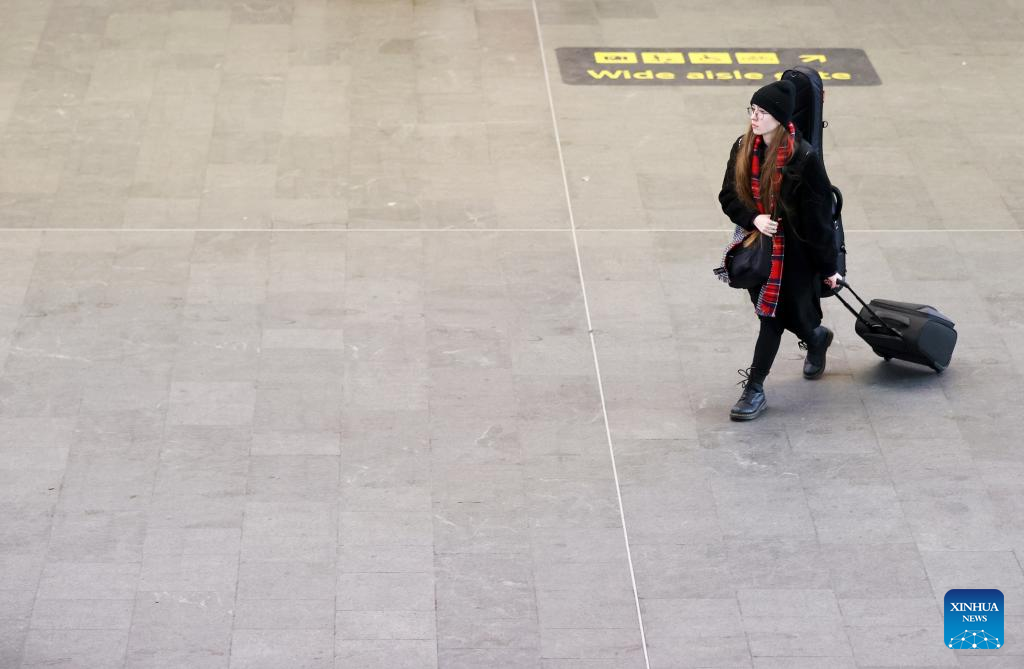 Uma passageira caminha na estação ferroviária de King's Cross em Londres, Grã-Bretanha, em 17 de dezembro de 2022. O Reino Unido enfrenta semanas de greves massivas durante a temporada de Natal por trabalhadores dos correios e transportes, enfermeiras e guardas de fronteira. Uma onda de ações industriais começou na terça-feira, com mais de 40.000 membros do Sindicato Nacional dos Trabalhadores Ferroviários, Marítimos e de Transportes (RMT, em inglês) parando por 48 horas. Mais três semanas de interrupção estão programadas para acontecer. (Xinhua/Li Ying)