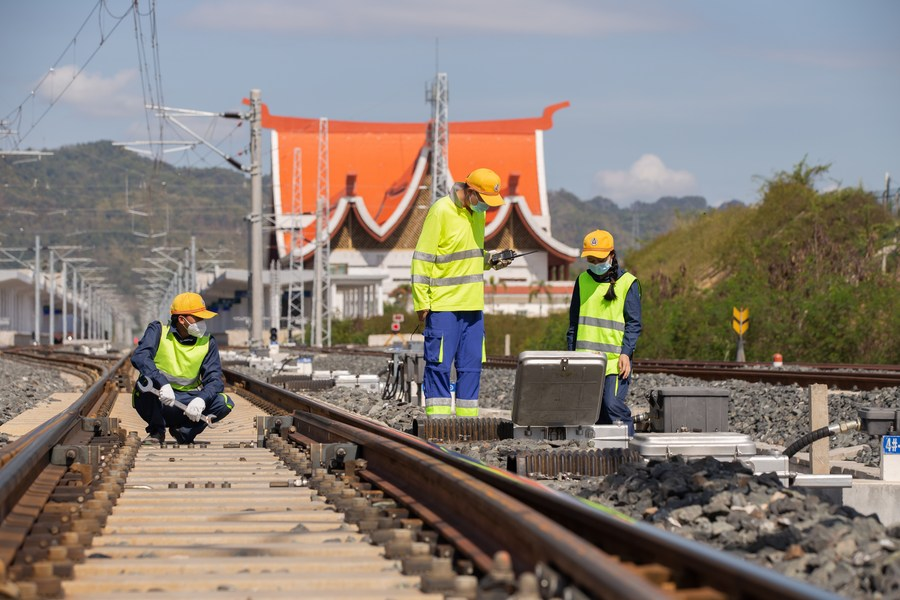 Funcionários chineses e do Laos cuidam da ferrovia em Luang Prabang, Laos, no dia 1º de dezembro de 2022. (Foto por Kaikeo Saiyasane/Xinhua)