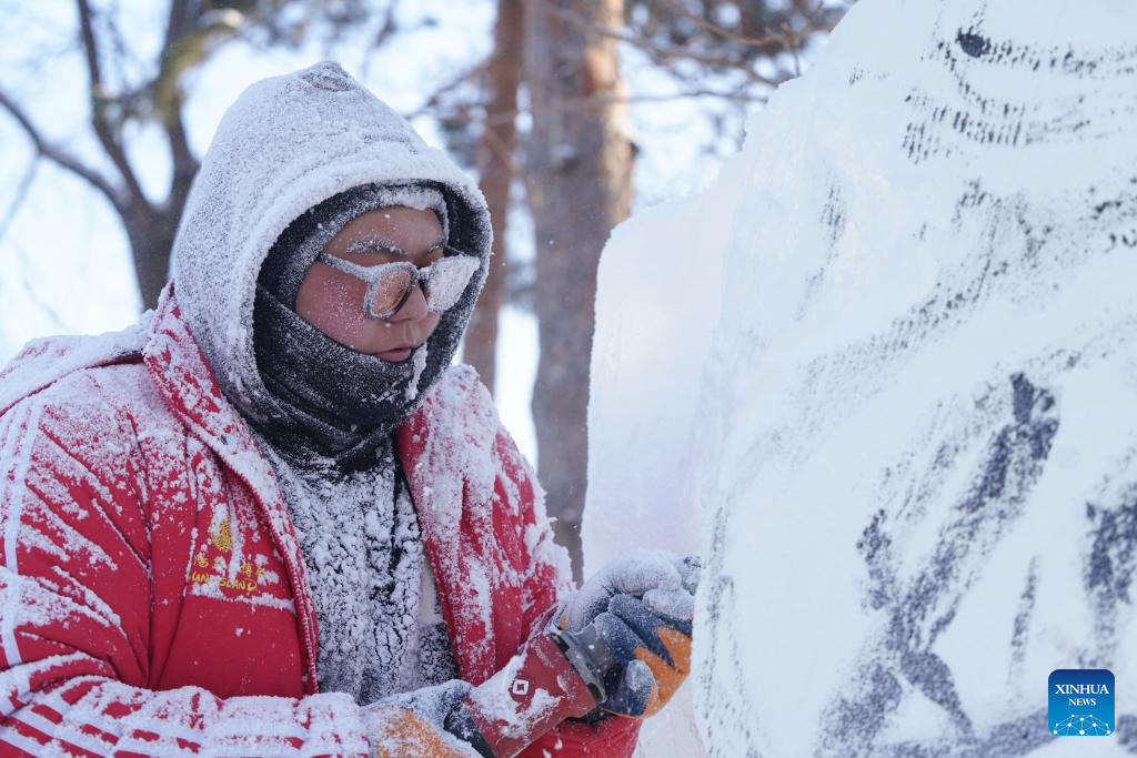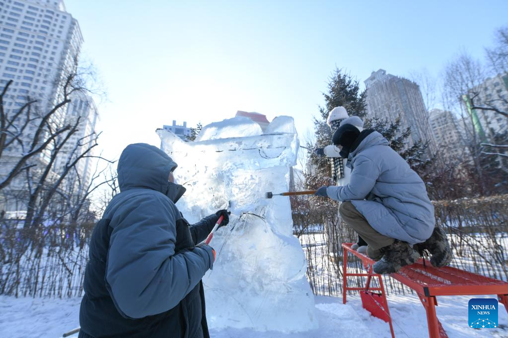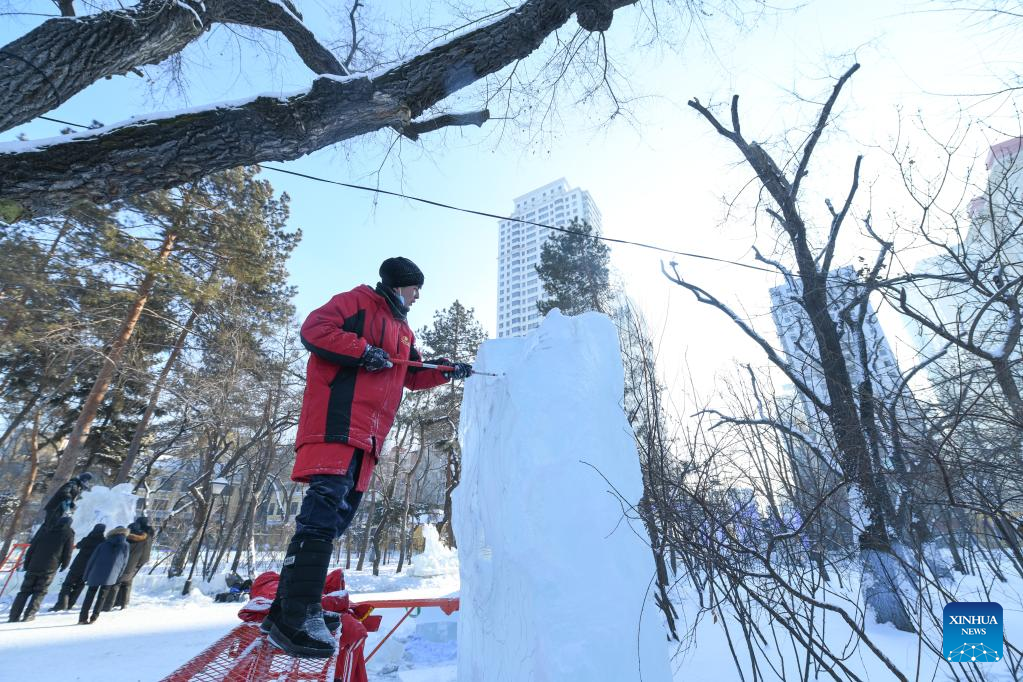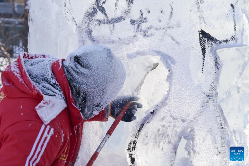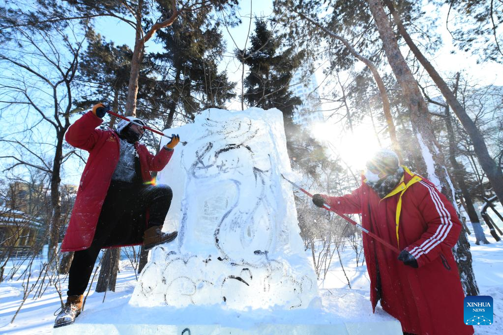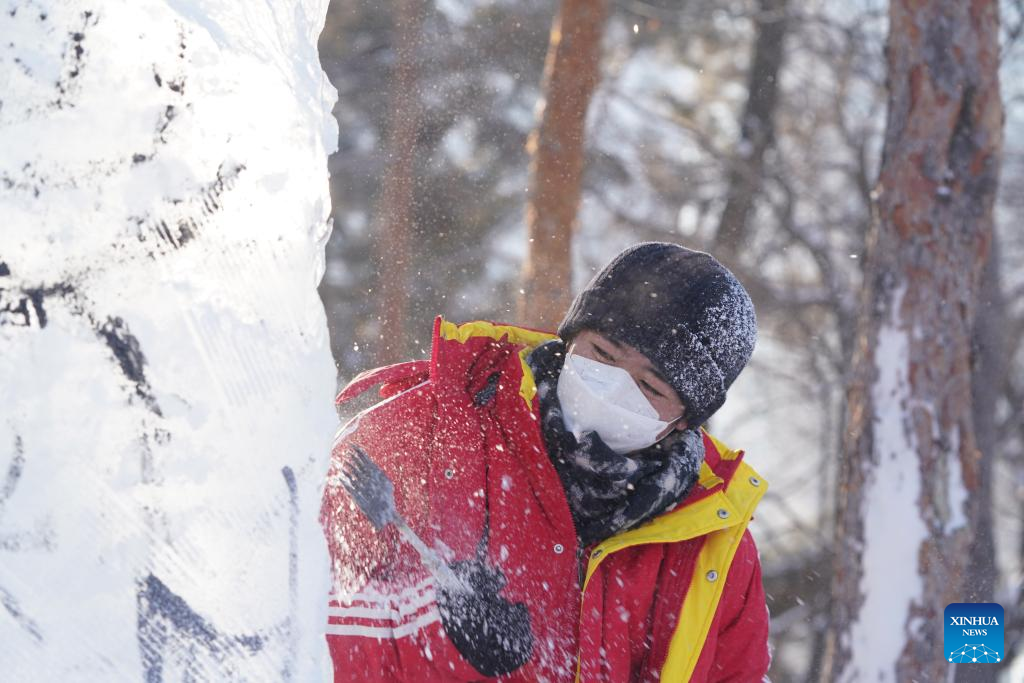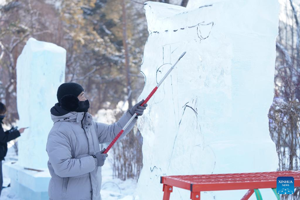 A contestant works on an ice sculpture during a competition in Zhaolin Park in Harbin, northeast China's Heilongjiang Province, Dec. 29, 2022. A nationwide ice sculpture competition for college students kicked off here on Thursday. (Xinhua/Wang Song)