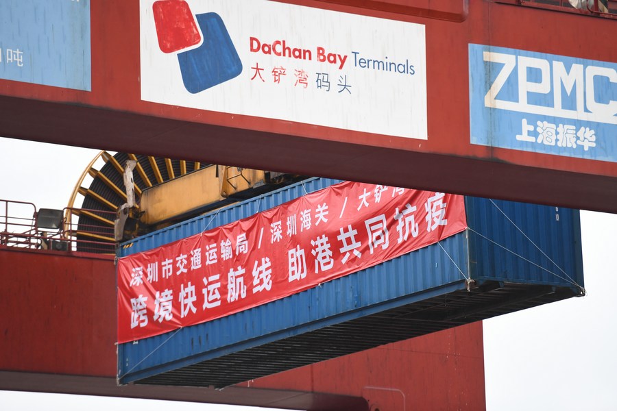 Um contêiner de suprimentos para Hong Kong é carregado em um navio no cais de Dachanwan, no porto de Shenzhen, Província de Guangdong, sul da China, em 21 de fevereiro de 2022. (Xinhua/Liang Xu)