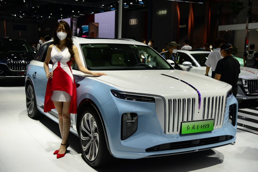 Um veículo de nova energia da Hongqi está em exibição durante a 19ª Exposição Internacional de Automóveis da China (Changchun) em Changchun, capital da Província de Jilin, nordeste da China, em 18 de julho de 2022. (Xinhua/Zhang Jian)