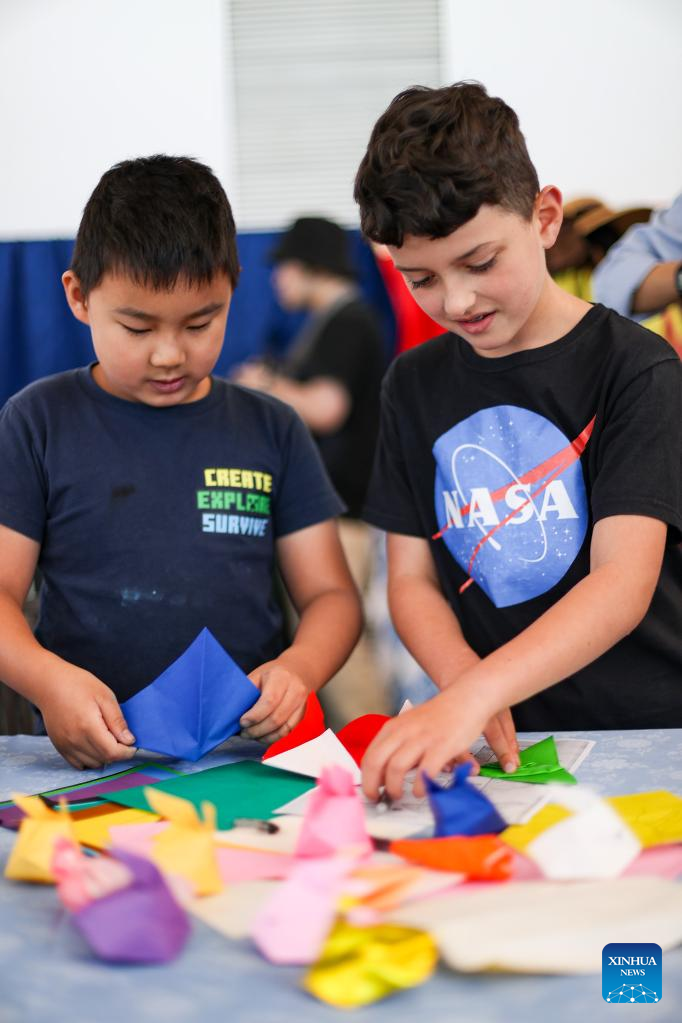Crianças testam a arte de dobrar papel em evento comemorativo especial realizado no Museu Marítimo Nacional da Austrália em Sydney, Austrália, no dia 4 de fevereiro de 2023. (Xinhua/Bai Xuefei)