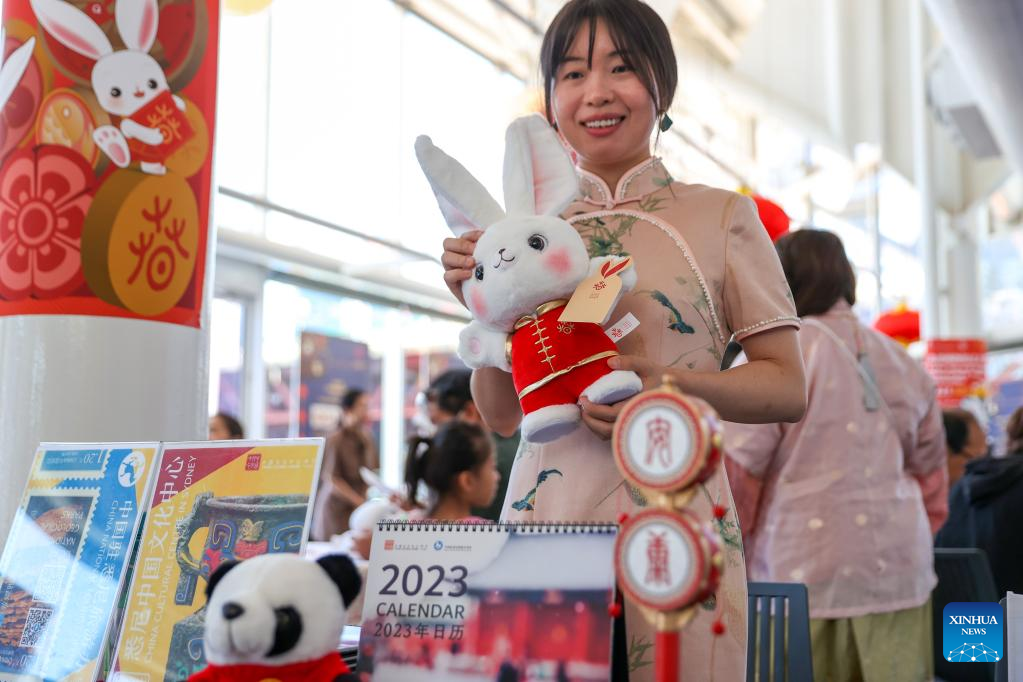 Membro da equipe mostra mascote de coelho em evento comemorativo especial realizado no Museu Marítimo Nacional da Austrália em Sydney, Austrália, no dia 4 de fevereiro de 2023. (Xinhua/Bai Xuefei)