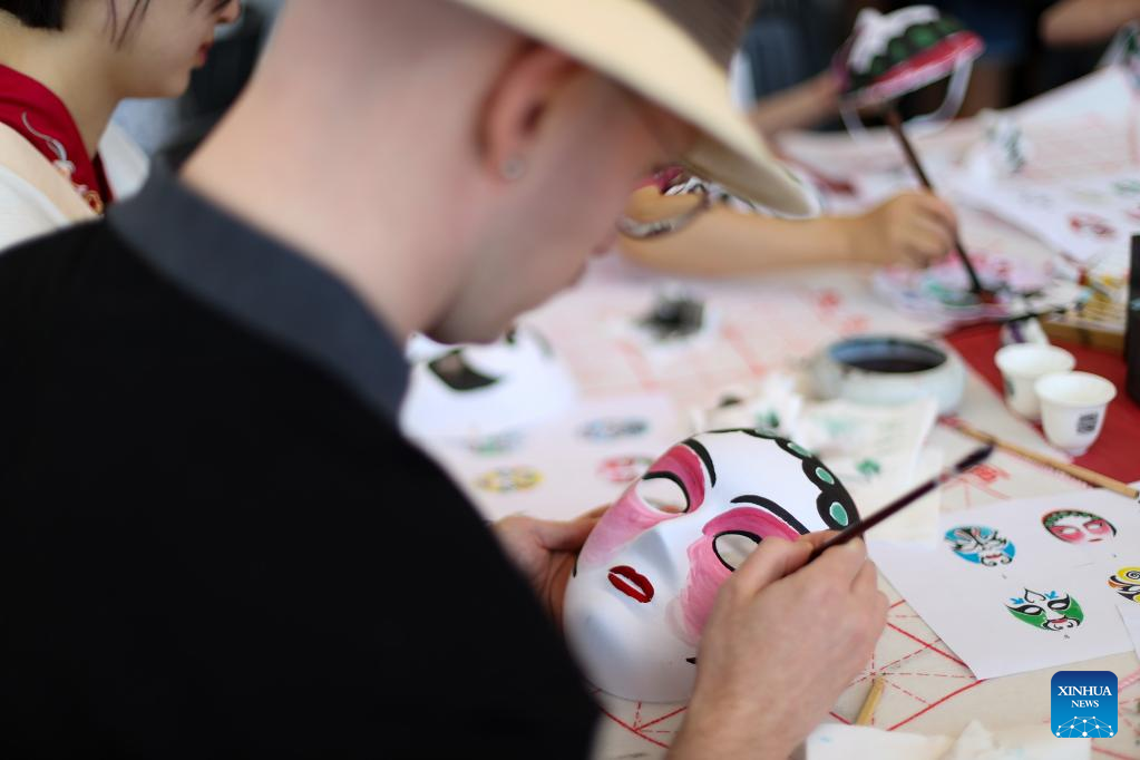 Visitantes pintam máscaras de ópera chinesa em um evento comemorativo especial no Museu Marítimo Nacional da Austrália em Sydney, Austrália, no dia 4 de fevereiro de 2023. (Xinhua/Bai Xuefei)