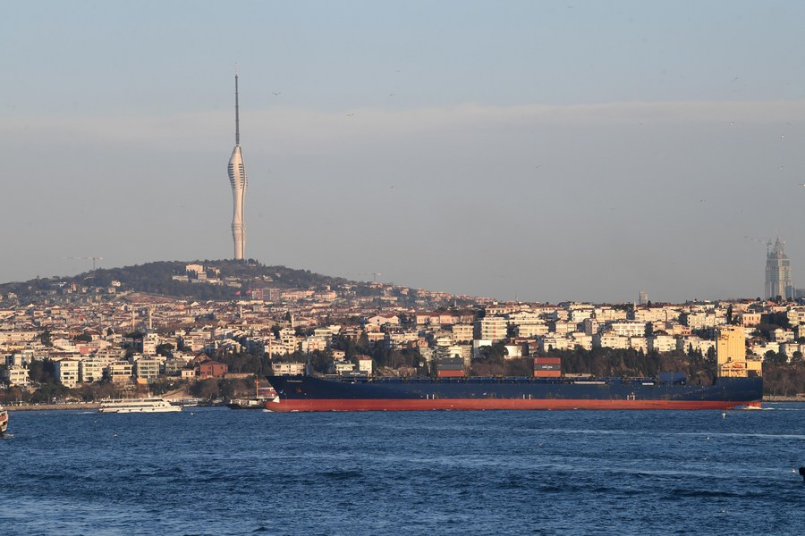Foto tirada no dia 21 de dezembro de 2022 mostra o Estreito de Bósforo em Istambul, Turquia. (Xinhua/Shadati)