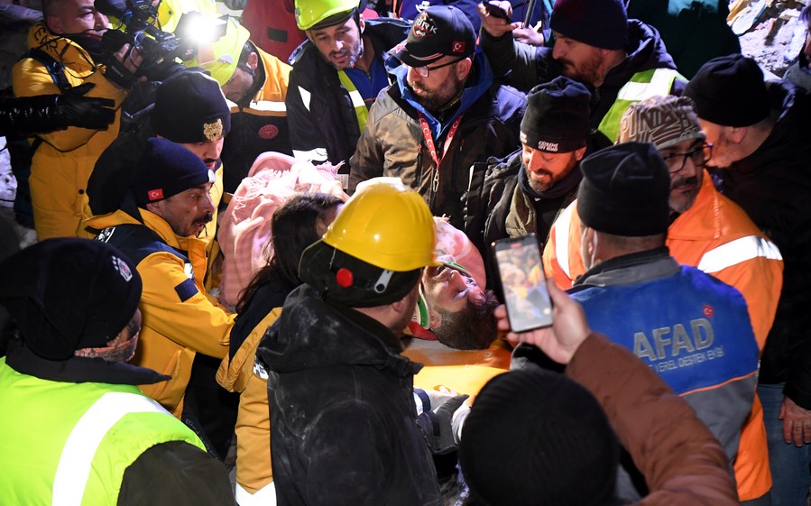 Um sobrevivente é resgatado dos escombros de um prédio destruído no distrito de Elbistan atingido pelo terremoto, em Kahramanmaras, Turquia, em 7 de fevereiro de 2023. (Xinhua/Shadati)
