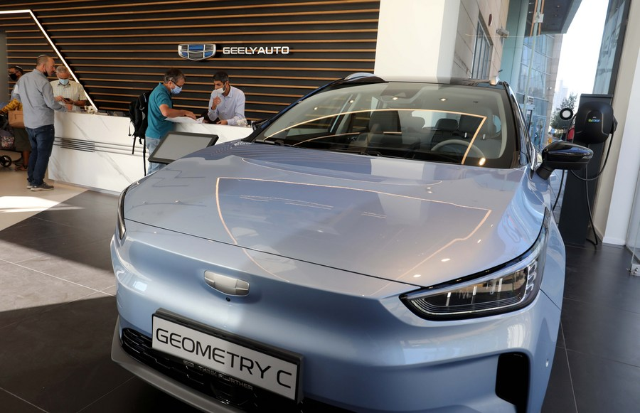 Pessoas visitam uma montadora que vende carros elétricos fabricados pela chinesa Geely Auto em Tel Aviv, Israel, em 10 de novembro de 2021. (Foto por Gil Cohen Magen/Xinhua)