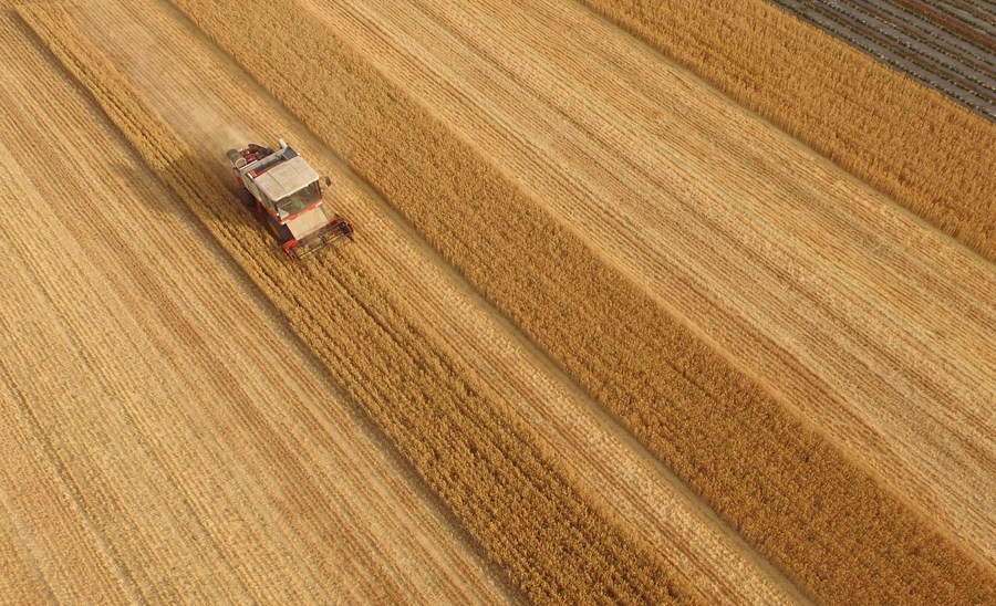 Foto aérea tirada em 5 de junho de 2022 mostra uma ceifeira colhendo trigo na véspera do dia de "Mangzhong", ou de "Grão na Espiga", na vila de Bianqiao, distrito de Pingyi, cidade de Linyi, Província de Shandong, leste da China. (Foto por Wu Jiquan/Xinhua)