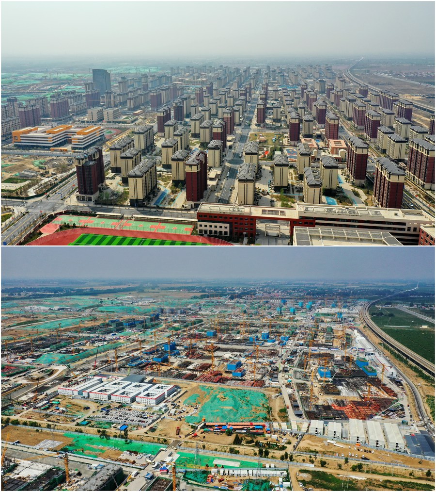 Montagem mostra a vista aérea da área Rongxi em 31 de março de 2023 (acima) e o local de construção da mesma em 3 de julho de 2021, na Nova Área de Xiong'an, Província de Hebei, norte da China. (Xinhua/Mu Yu)