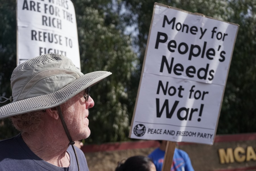 Manifestante em frente à Estação Aérea do Corpo de Fuzileiros Navais de Miramar, 25 quilômetros ao norte do centro de San Diego, Califórnia, Estados Unidos, no dia 18 de março de 2023. (Foto por Zeng Hui/Xinhua)