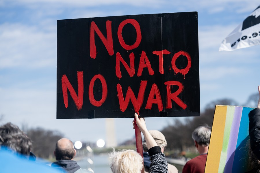 Manifestante segura slogan em manifestação antiguerra em Washington, D.C., Estados Unidos, no dia 19 de fevereiro de 2023. (Xinhua/Liu Jie)
