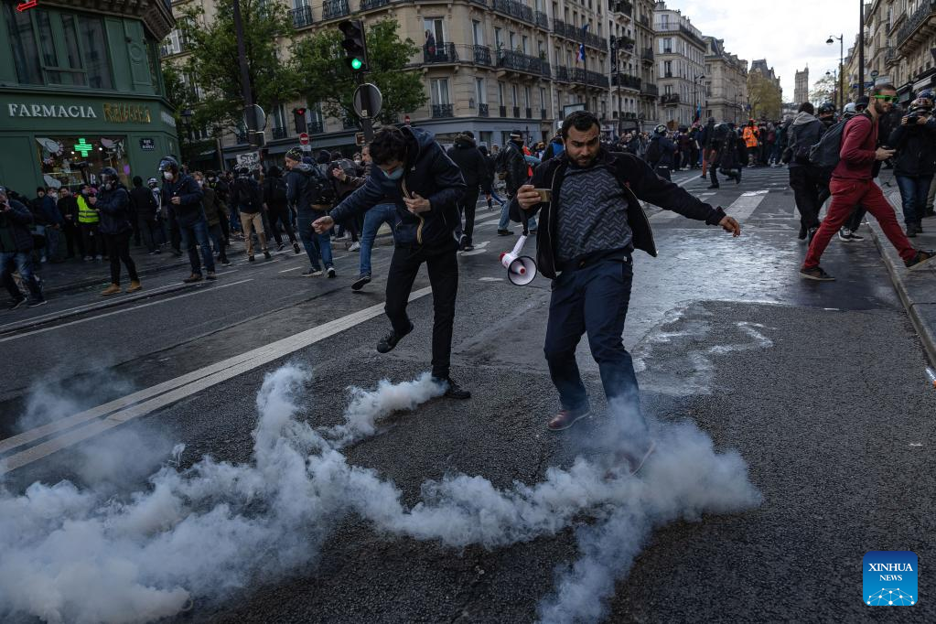 Manifestantes tentam chutar bombas de gás lacrimogêneo durante manifestação contra plano de reforma previdenciária em Paris, França, no dia 13 de abril de 2023. Cerca de 380 mil pessoas participaram da 12ª mobilização geral nacional organizada pelos sindicatos contra o plano de reforma previdenciária do governo, informou o Ministério do Interior francês na quinta-feira. (Foto por Aurelien Morissard/Xinhua)