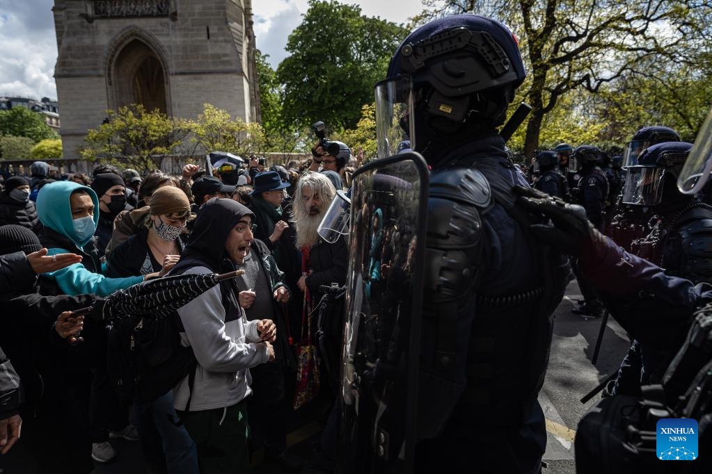 Manifestantes confrontam gendarmes franceses e a tropa de choque do CRS durante manifestação contra plano de reforma previdenciária em Paris, França, no dia 13 de abril de 2023. Cerca de 380.000 pessoas participaram da 12ª mobilização geral nacional organizada pelos sindicatos contra o plano de reforma previdenciária do governo, informou o Ministério do Interior francês na quinta-feira. (Foto por Aurelien Morissard/Xinhua)