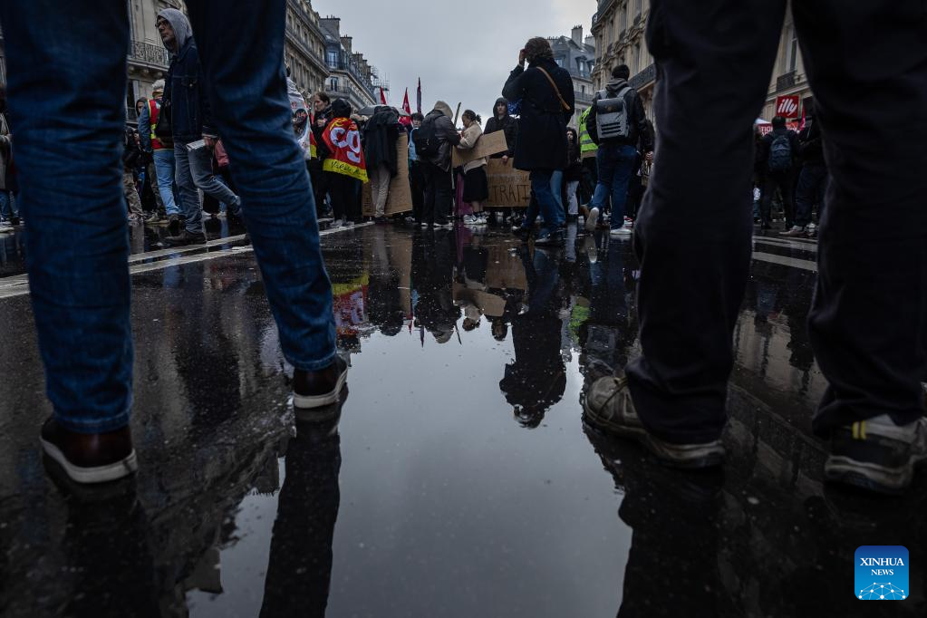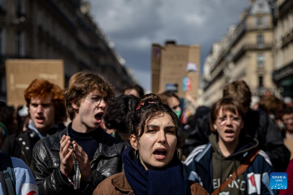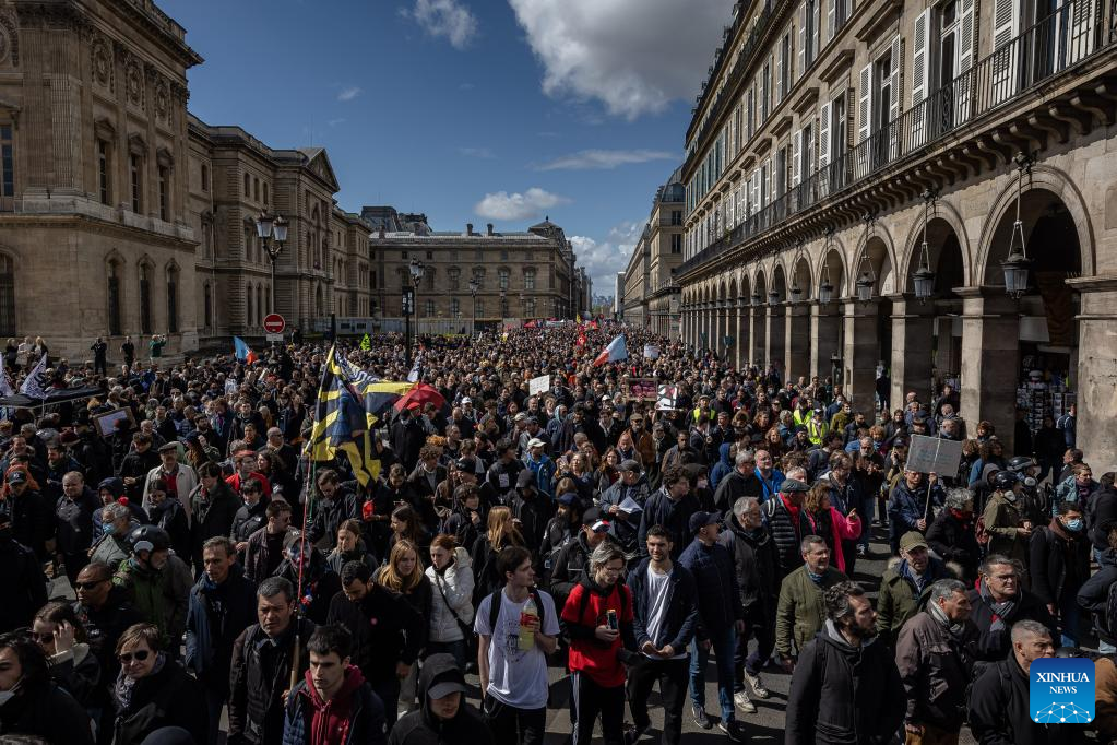 Participantes de manifestação contra plano de reforma previdenciária em Paris, França, no dia 13 de abril de 2023. Cerca de 380.000 pessoas participaram da 12ª mobilização geral nacional organizada pelos sindicatos contra o plano de reforma previdenciária do governo, informou o Ministério do Interior francês na quinta-feira. (Foto por Aurelien Morissard/Xinhua)