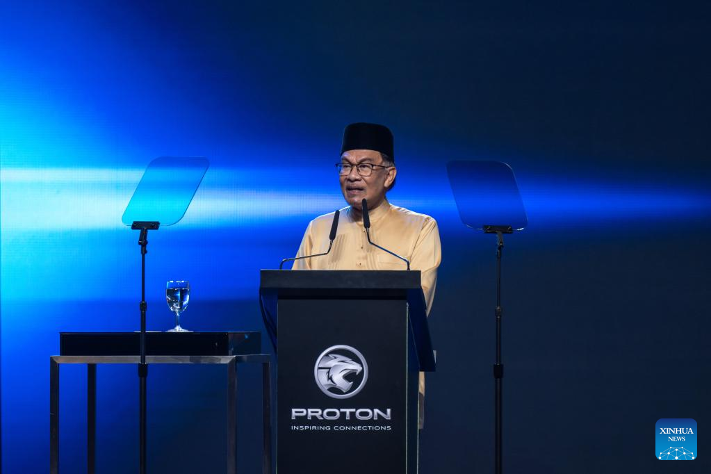 O primeiro-ministro da Malásia, Anwar Ibrahim, fala no lançamento oficial do mais novo modelo da Proton, o veículo utilitário esportivo (SUV, na sigla em inglês) Proton X90, em Kuala Lumpur, Malásia, no dia 7 de maio de 2023. A parceria contínua e a estreita cooperação entre a montadora nacional malaia Proton e a chinesa Geely são de importância estratégica, disse no domingo o primeiro-ministro da Malásia, Anwar Ibrahim. (Xinhua/Zhu Wei)