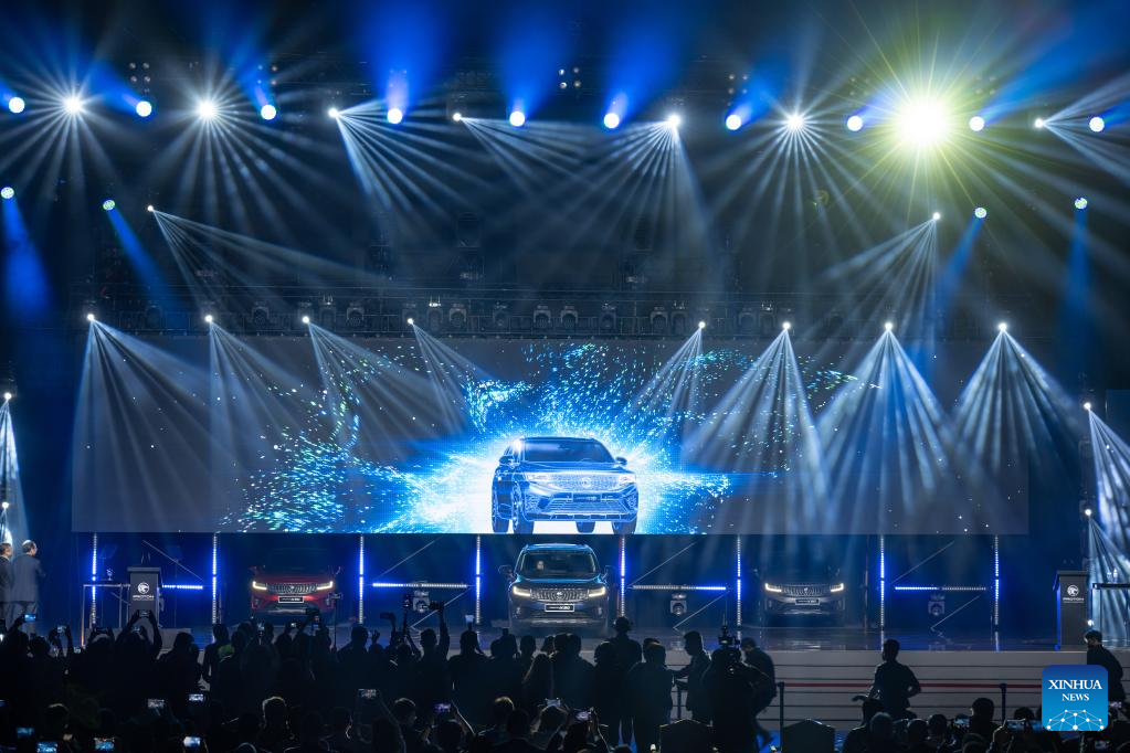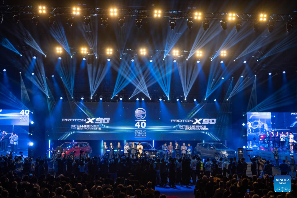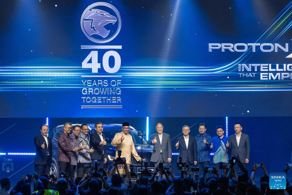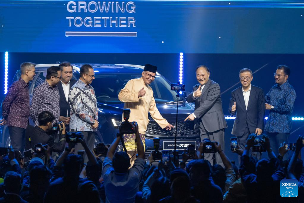 O mais novo modelo da Proton, o veículo utilitário esportivo Proton X90 (SUV), é lançado oficialmente em Kuala Lumpur, Malásia, no dia 7 de maio de 2023. A parceria contínua e a estreita cooperação entre a montadora nacional malaia Proton e a chinesa Geely são de importância estratégica, disse no domingo o primeiro-ministro da Malásia, Anwar Ibrahim. (Xinhua/Zhu Wei)