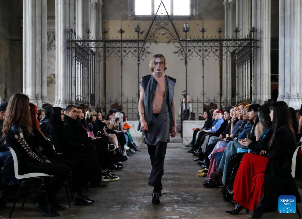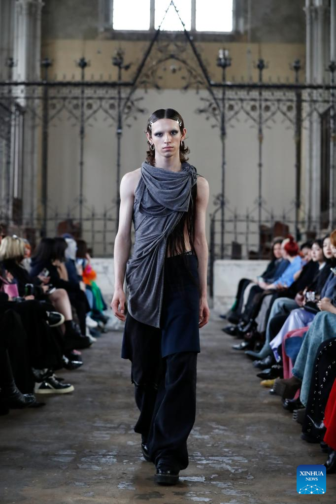 Modelo desfila para a marca adarksecret 23SS em Londres, Grã-Bretanha, no dia 13 de maio de 2023. (Xinhua/Han Yan)