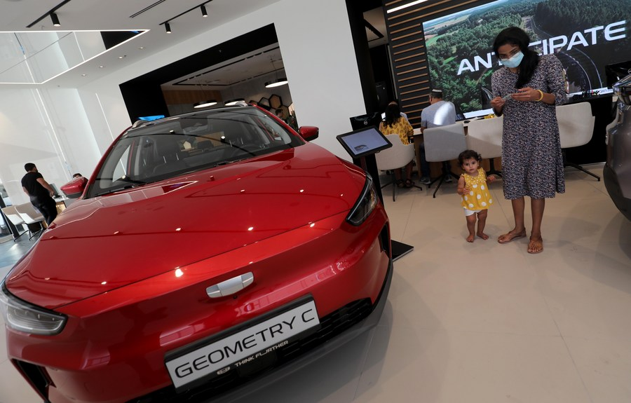 Visitantes em montadora que vende carros elétricos fabricados pela Geely Auto da China em Tel Aviv, Israel, no dia 10 de novembro de 2021. A montadora chinesa Geely Auto Group começou as vendas de carros elétricos em Israel com a concessionária israelense Union Group. (Foto por Gil Cohen Magen/Xinhua)