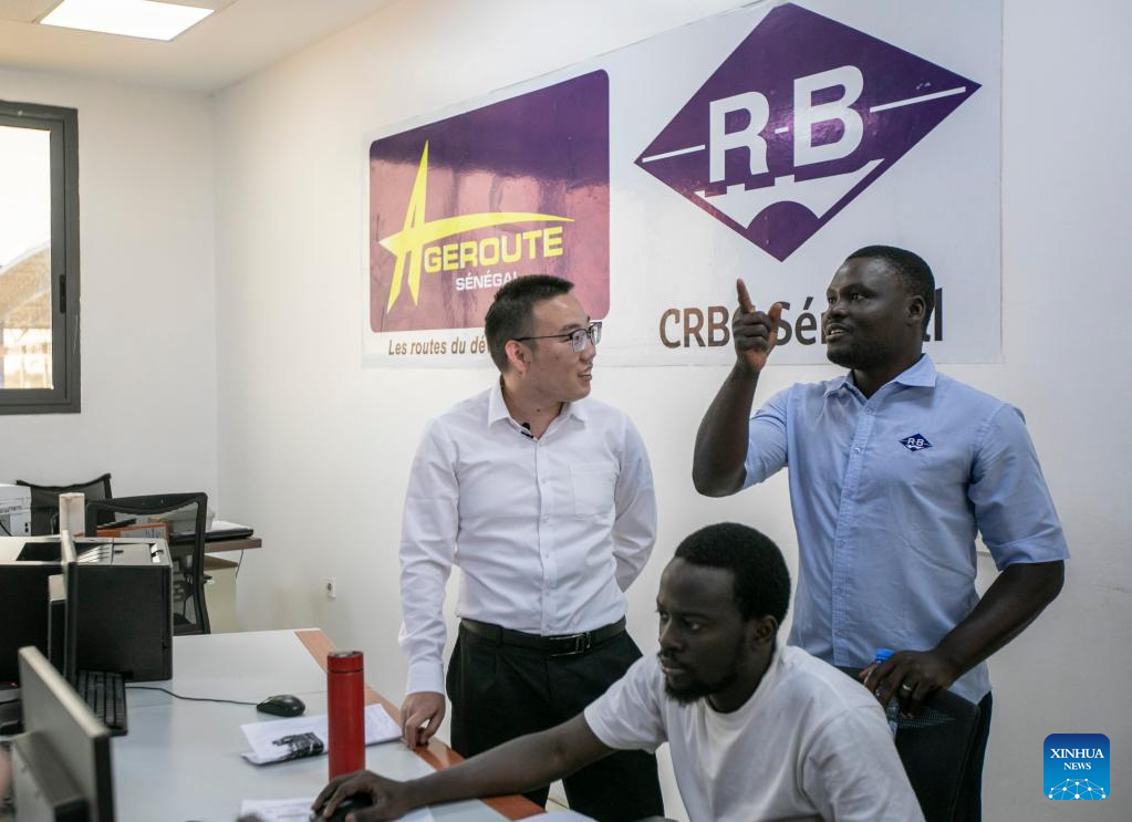 Leon Kossivi (1º d) conversa com seus colegas em uma sala de serviço perto de Thies, Senegal, em 13 de maio de 2023. (Xinhua/Li Yahui)