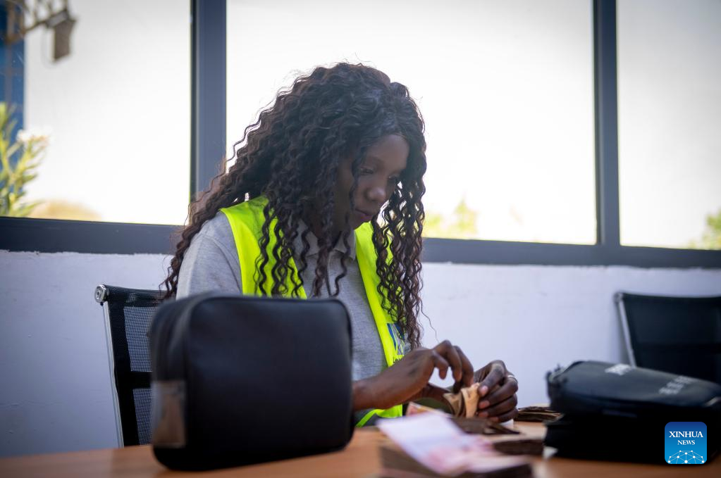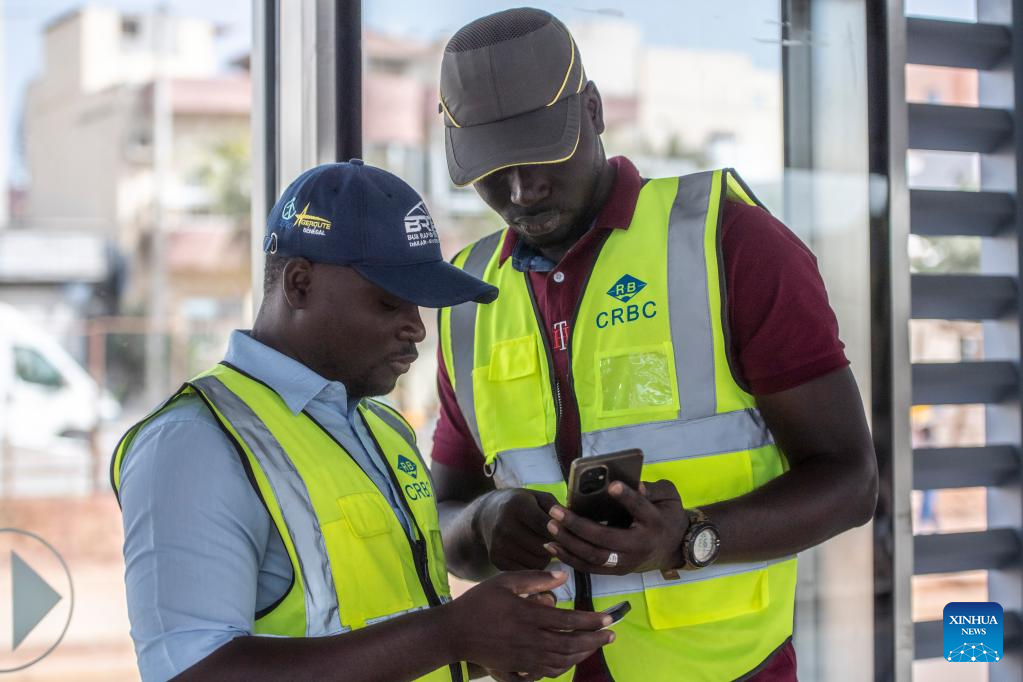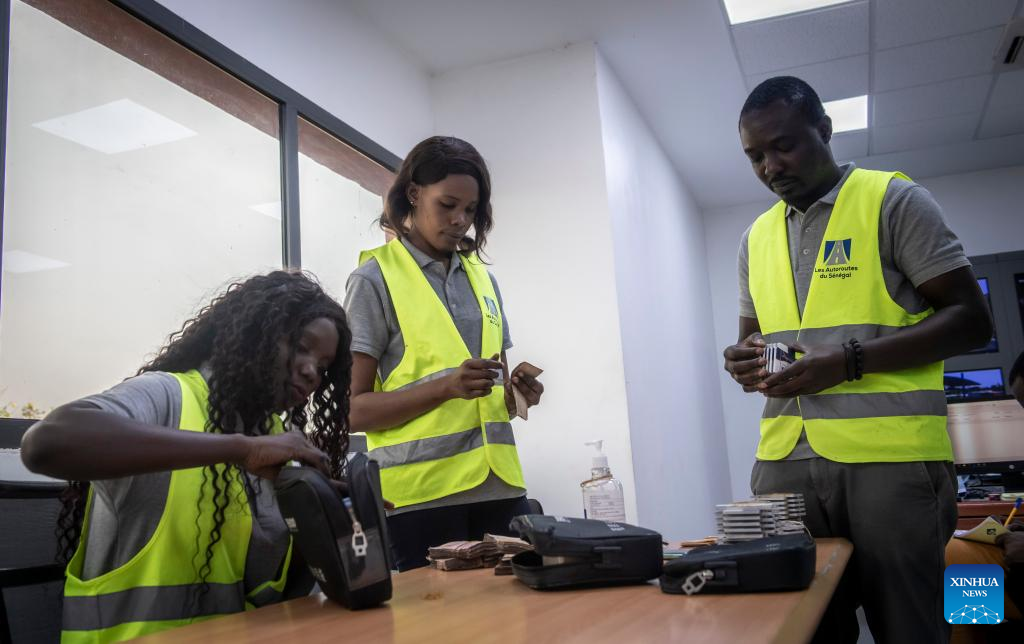 Monique (1º e), esposa de Leon Kossivi, trabalha com seus colegas em um posto de pedágio na rodovia Ila-Touba, no Senegal, no dia 13 de maio de 2023. (Xinhua/Li Yahui)