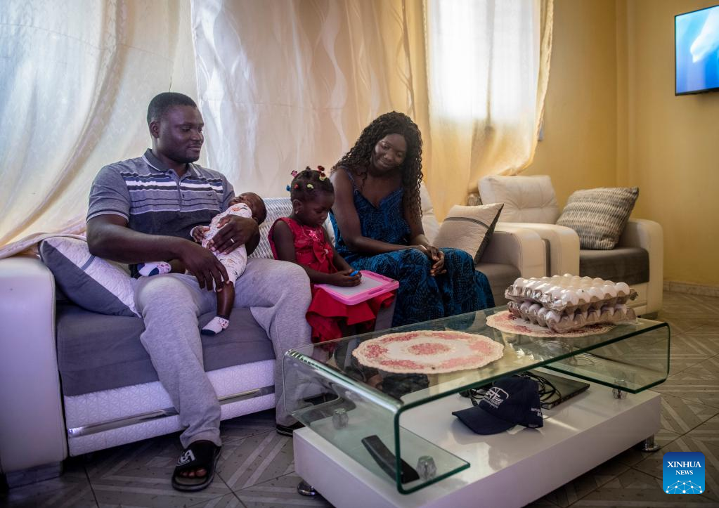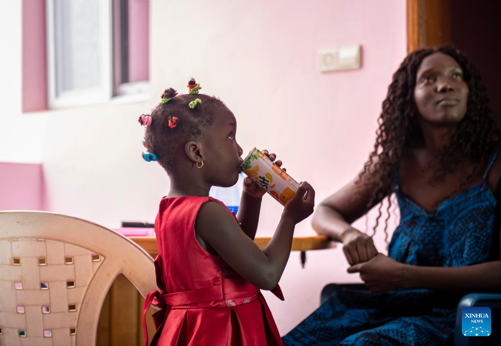 Monique, esposa de Leon Kossivi, passa algum tempo com a filha antes de ir trabalhar em Thies, Senegal, no dia 13 de maio de 2023. (Xinhua/Li Yahui)