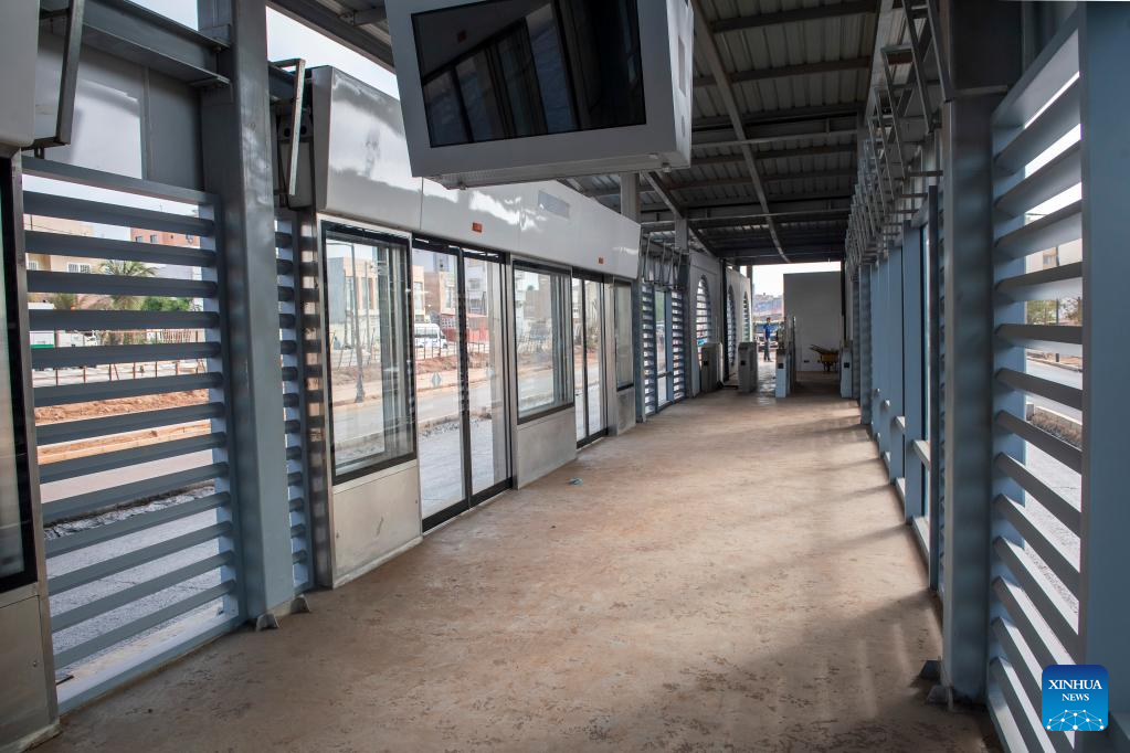 Foto tirada em 13 de maio de 2023 mostra uma vista interna de uma estação de BRT em construção em Dacar, Senegal. (Xinhua/Li Yahui)