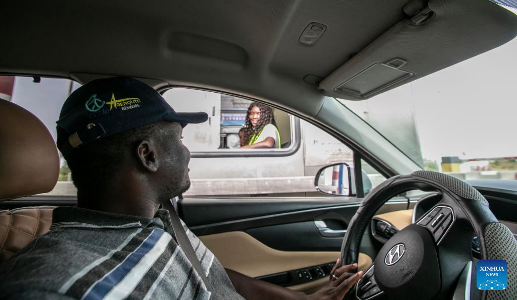 Leon Kossivi (frente) dirige seu carro passando pelo posto de pedágio onde sua esposa Monique (atrás) está de plantão na rodovia Ila-Touba, no Senegal, no dia 13 de maio de 2023. (Xinhua/Li Yahui)
