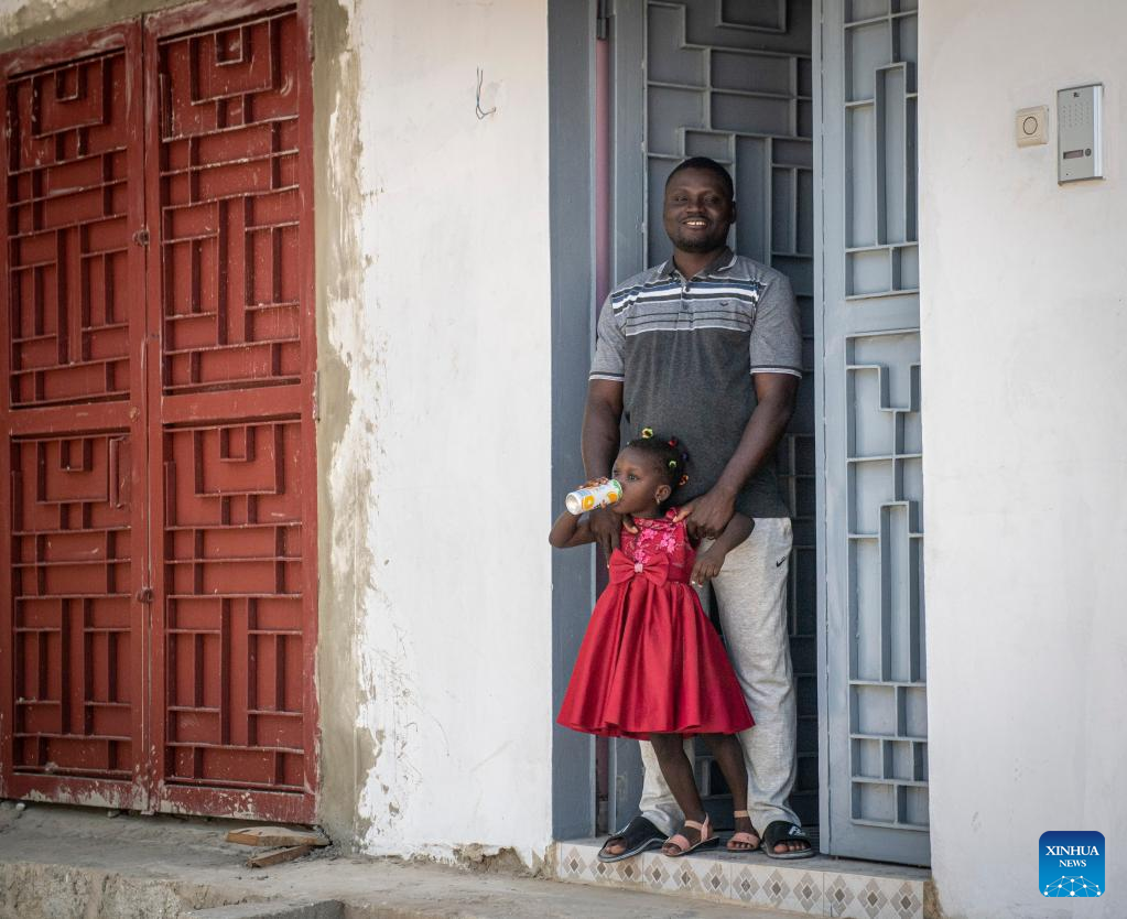 Leon Kossivi e sua filha são fotografados em sua nova residência em Thies, Senegal, no dia 13 de maio de 2023. (Xinhua/Li Yahui)