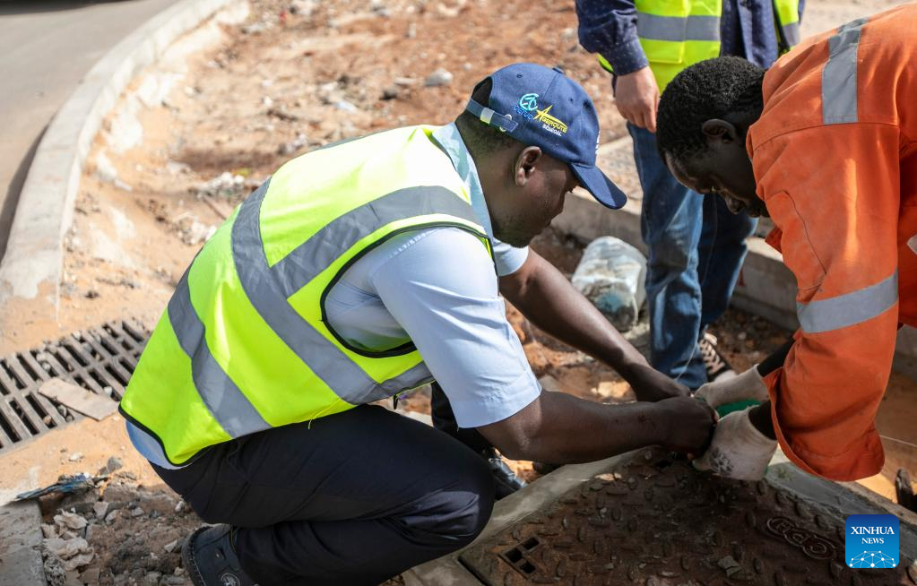 Leon Kossivi (1º e) e seus colegas verificam um poço de cabo de um projeto em Dacar, capital do Senegal, no dia 13 de maio de 2023. (Xinhua/Li Yahui)