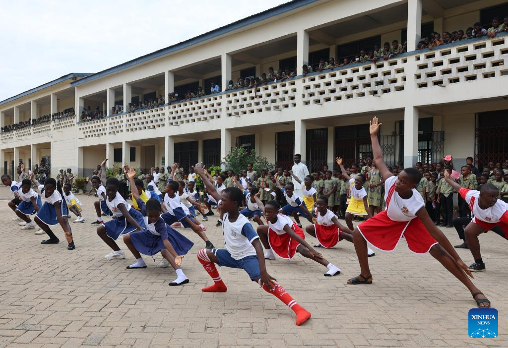 Estudantes praticam artes marciais chinesas na Escola de Ensino Fundamental da Universidade de Cape Coast, em Cape Coast, Gana, no dia 17 de junho de 2023. É uma sexta-feira comum em Cape Coast, capital da região central de Gana, que faz fronteira com o Oceano Atlântico. Em uma sala de aula da Escola de Ensino Fundamental da Universidade de Cape Coast (UCC), os estudantes têm aula de chinês com muita empolgação. (Foto por Seth/Xinhua)