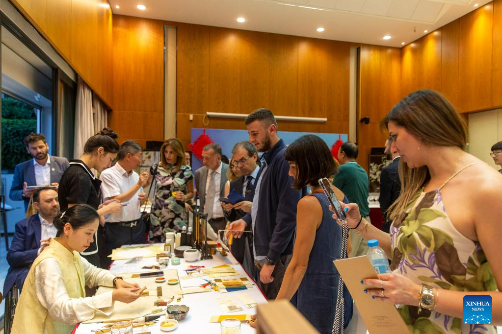 Pessoas assistem à demonstração de escrita chinesa na embaixada chinesa em Atenas, Grécia, no dia 22 de junho de 2023. A cooperação China-Países da Europa Central e Oriental (PECO) foi comemorada em uma recepção realizada na embaixada chinesa em Atenas na quinta-feira. (Xinhua/Marios Lolos)