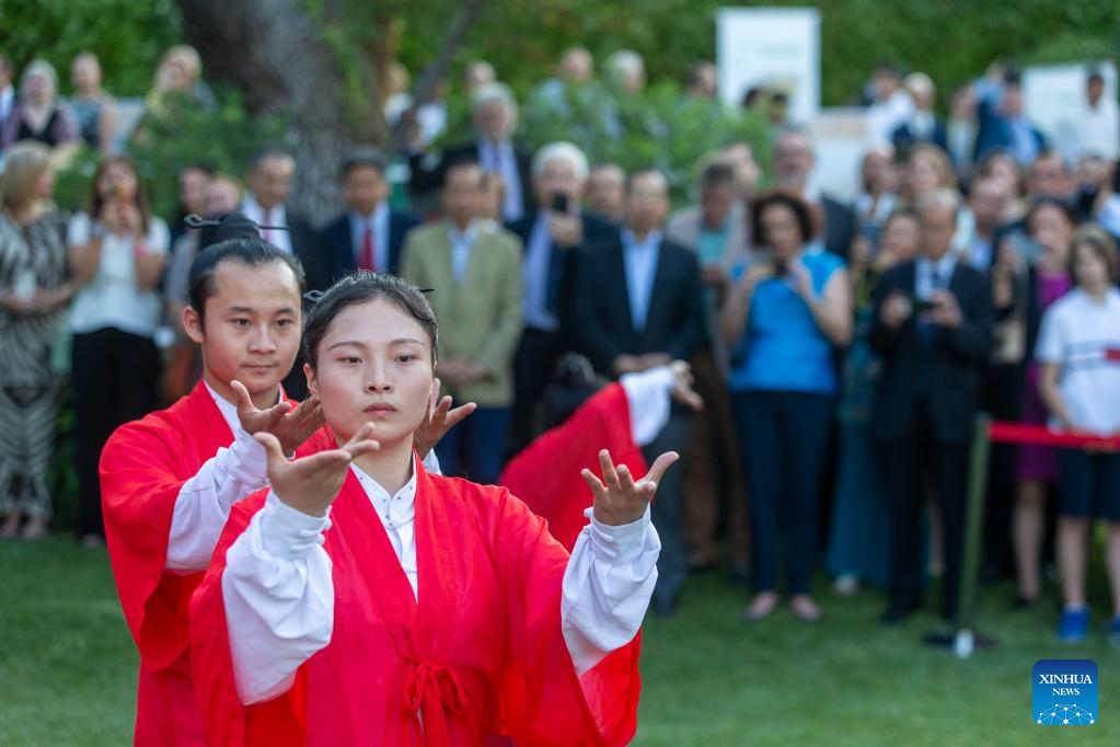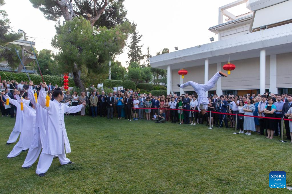 Pessoas assistem à apresentação de Taiji (Tai Chi) na embaixada chinesa em Atenas, Grécia, no dia 22 de junho de 2023. A cooperação China-Países da Europa Central e Oriental (PECO) foi comemorada em uma recepção realizada na embaixada chinesa em Atenas na quinta-feira. (Xinhua/Marios Lolos)
