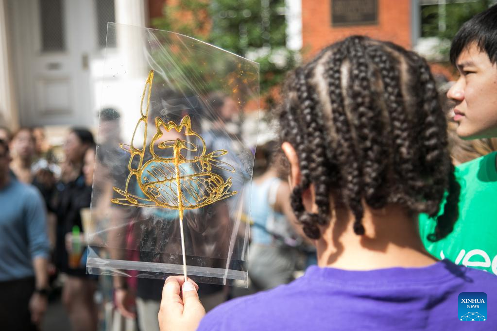 Um visitante carrega uma pintura de açúcar durante o Festival do Dragão em Nova York, Estados Unidos, no dia 24 de junho de 2023. Um novíssimo festival de gastronomia e cultura chinesa conquistou os corações e estômagos dos nova-iorquinos neste sábado com sua estreia em um trecho de uma rua no Parque da Praça Washington, no bairro de Lower Manhattan. (Foto por Michael Nagle/Xinhua)