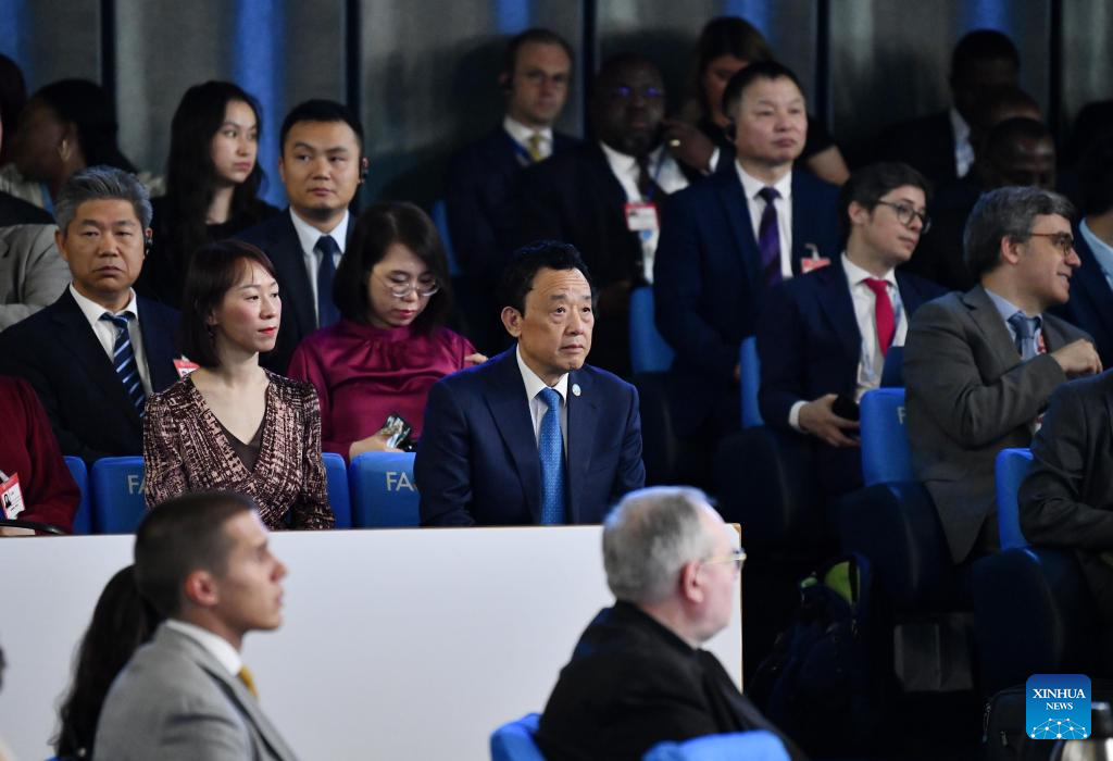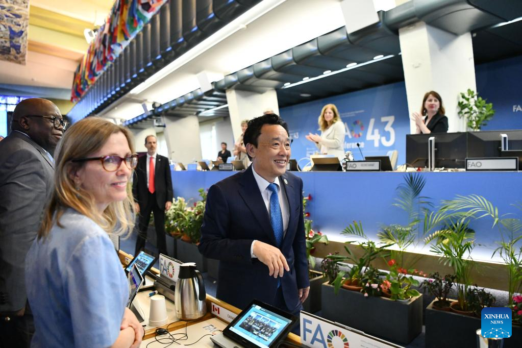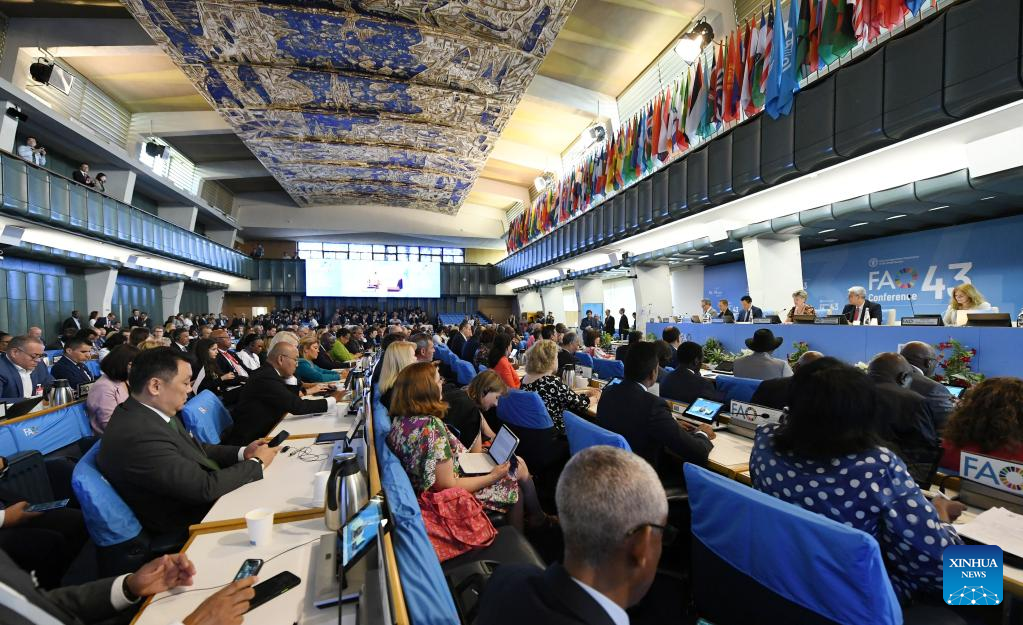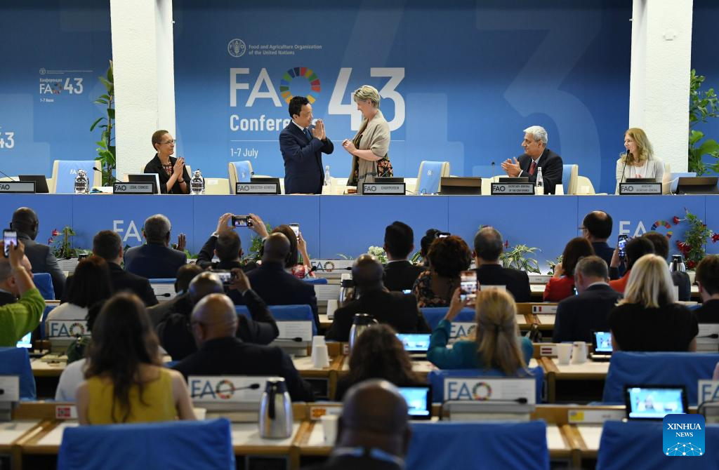 Foto tirada no dia 2 de julho de 2023 mostra uma cena na 43ª sessão da Conferência da Organização das Nações Unidas para Agricultura e Alimentação (FAO, em inglês) em Roma, Itália. Qu Dongyu foi reeleito diretor-geral da FAO neste domingo. (Xinhua/Jin Mamengni)