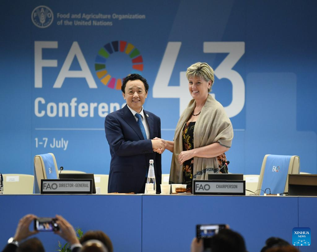 Roma, 2 jul (Xinhua) -- Qu Dongyu foi reeleito diretor-geral da Organização das Nações Unidas para Agricultura e Alimentação (FAO, em inglês) neste domingo durante a 43ª sessão da Conferência da FAO.