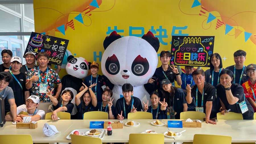 Jogadores da Coreia do sul de pólo aquático Lee Si-deok (à direita do panda central) e de taekwondo Park Hye-jin (à esquerda do panda central)- celebram seus aniversários durante a Universíade de Chengdu, em 30 de julho de 2023. (Xinhua/Shen Bohan)