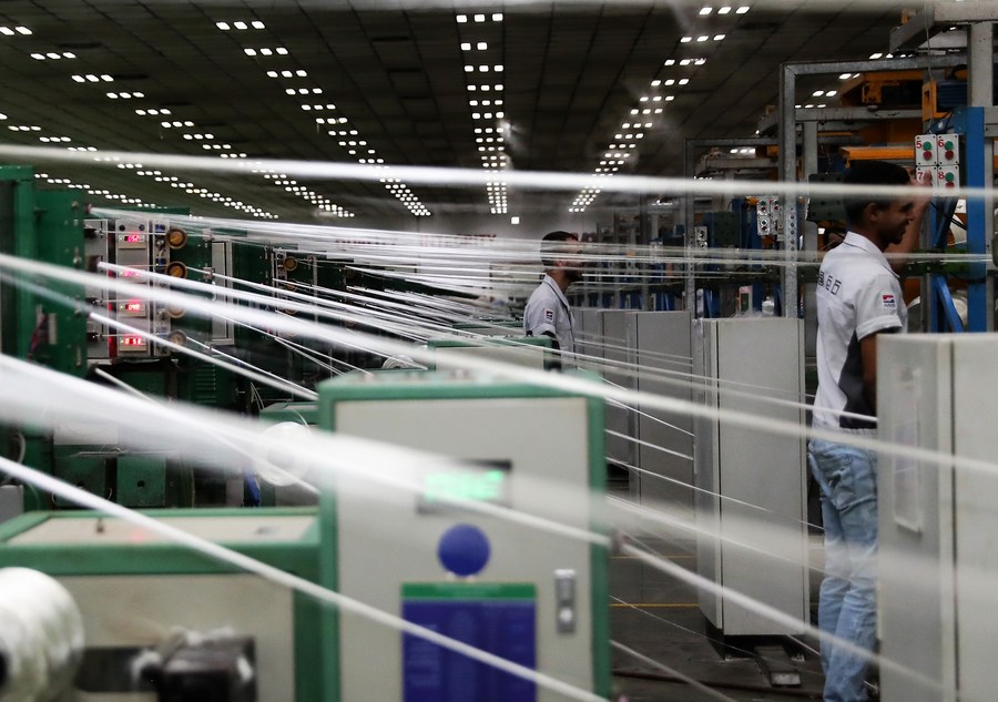 Funcionários trabalham na linha de produção de fibra de vidro da Jushi Egypt em Suez, Egito, no dia 26 de junho de 2023. (Xinhua/Wang Dongzhen)