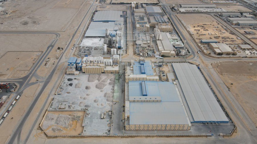Foto aérea tirada no dia 6 de janeiro de 2023 mostra a Jushi Egypt em Suez, Egito. (Jushi Egypt/Divulgação via Xinhua)