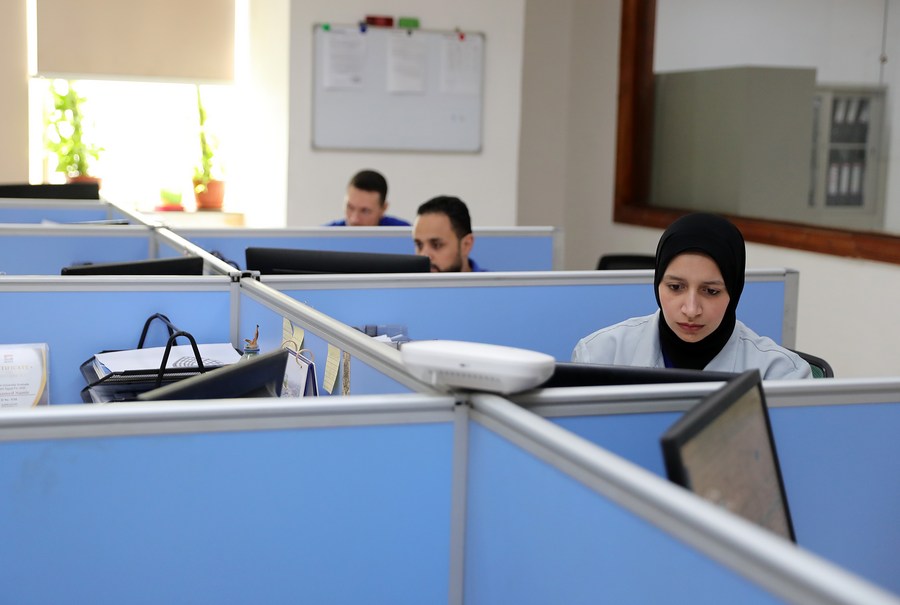 Dina Mahmoud (d), subgerente do departamento de planejamento e logística, trabalha no escritório da Jushi Egypt em Suez, Egito, no dia 26 de junho de 2023. (Xinhua/Wang Dongzhen)