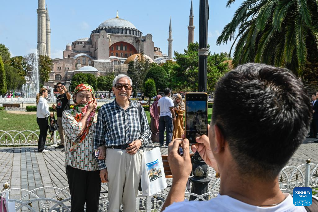 O grupo de excursão de 12 membros fará uma viagem de 8 dias pela Turquia. Wu Jian, vice-cônsul geral da China em Istambul, acompanhou o grupo para visitar a histórica Praça Sultanahmet, cercada pela icônica Cisterna da Basílica, Hagia Sophia e Mesquita Azul.