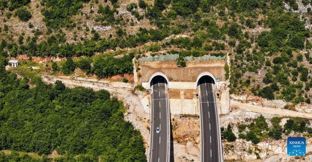 Foto aérea tirada no dia 24 de julho de 2023 mostra túneis em trecho prioritário da rodovia Bar-Boljare em Montenegro. (Foto por Wang Wei/Xinhua)